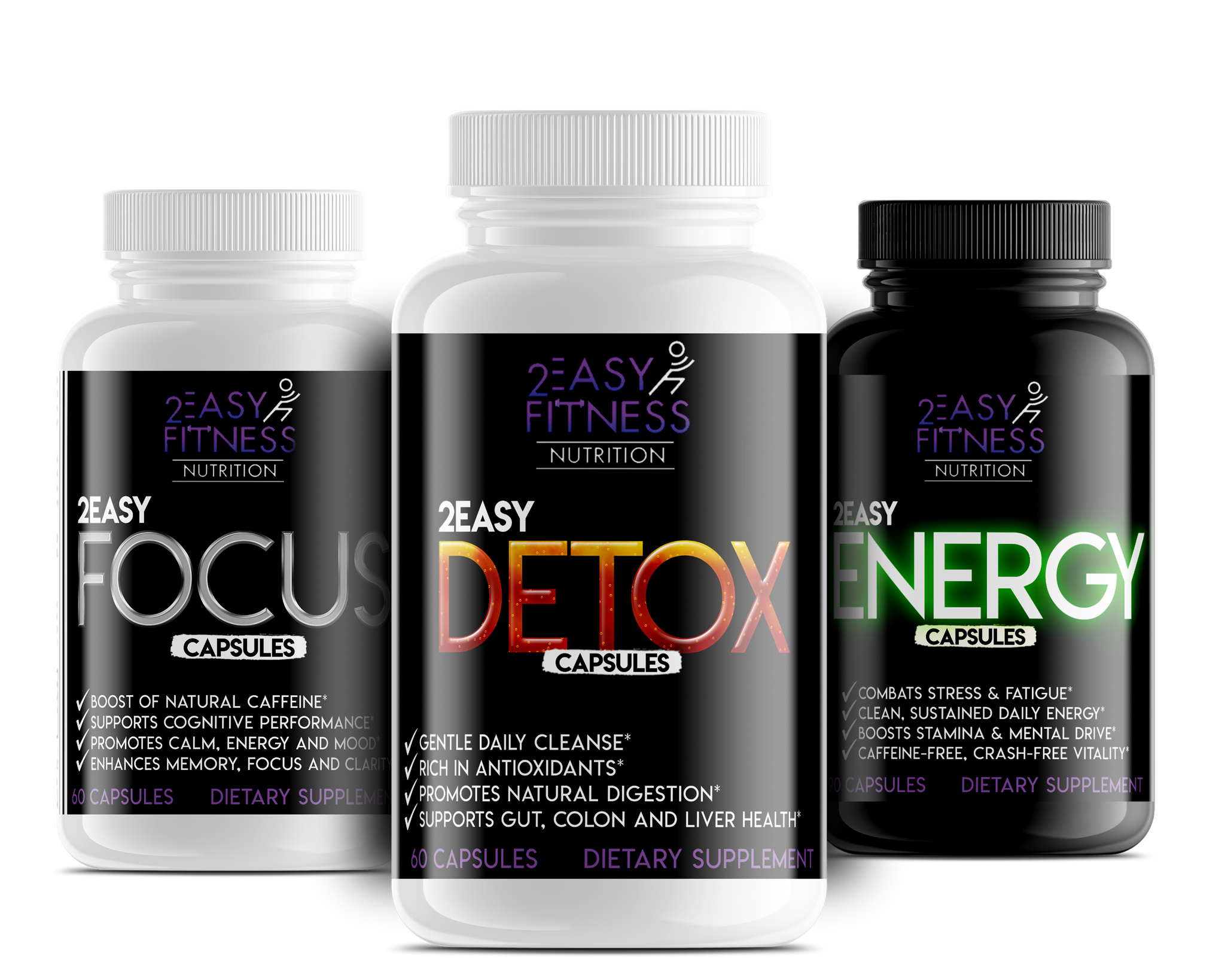 The 2EasyEssentials Bundle™ combines our three powerhouse formulas, 2EasyEnergy™, 2EasyFocus™, and 2EasyDetox™ for a COMPLETE system that supports your mind, body, and daily performance.