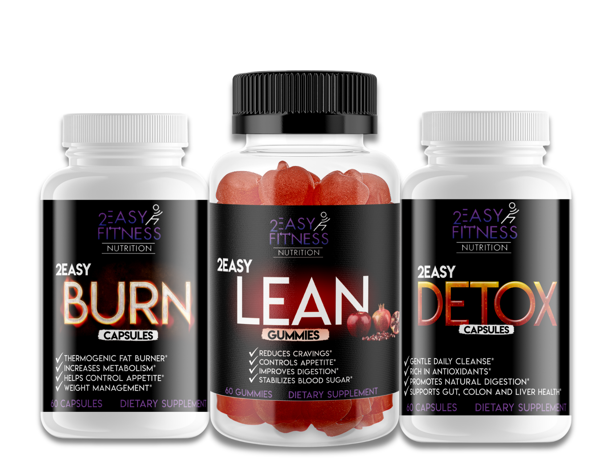 The 2EasyTotalTransformation™ Stack combines 2EasyDETOX™, 2EasyLEAN™ and 2EasyBURN™ into one complete system designed to support digestion, control cravings, boost energy and enhance fat-burning momentum.
